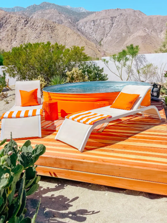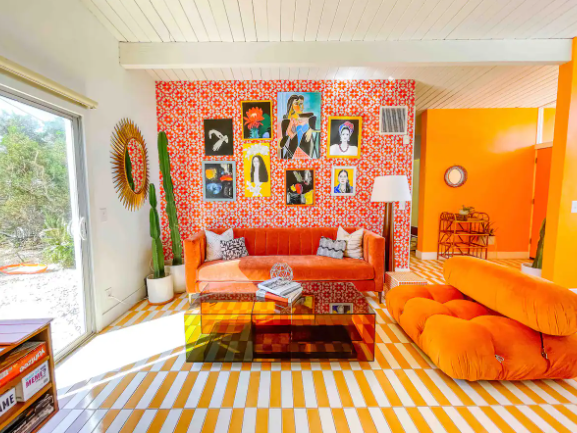 Owned by interior designer, Danie Dazey, and constructed in 1959 by famous architect, William Krisel, is this mid century home sitting in the desert of Palm Springs. Featuring 3 bedrooms, 1 bathroom, a spacious living area, kitchen, dining space, tons of outdoor seating, fire pit, an outdoor tub, and a hot tub. I LOVE how they stuck with a theme of colors, really makes the place stand out…and it’s done in a way that isn’t tacky.