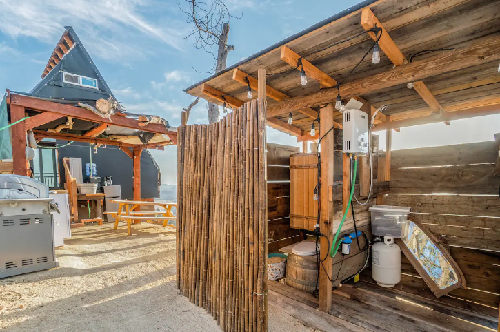 This a-frame is constructed of lumber and canvas, so bring a sweater because it can get chilly! There is a California king bed, a twin bed in the loft, and a couch in the a-frame. Along with a deck that has seating and a firepit! A couple of steps away is an outdoor kitchen with a mini fridge, coffee maker, sink, etc. There is also an outdoor shower and compost toilet. If off-grid living is your thing, definitely consider staying here. I’ve always wanted to do something like this! I can’t imagine how many stars you could see up there.